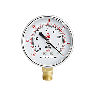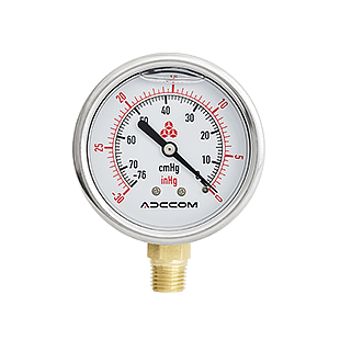 Indicador de vacío fabricado en acero inoxidable y conexión de bronce (inferior), con carátula llena de glicerina, ideal para lineas e instalaciones con vibraciones o con golpes de presión. 30-0 inHg