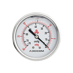 Indicador de vacío fabricado en acero inoxidable y conexión de bronce (inferior), con carátula llena de glicerina, ideal para lineas e instalaciones con vibraciones o con golpes de presión. 30-0 inHg
